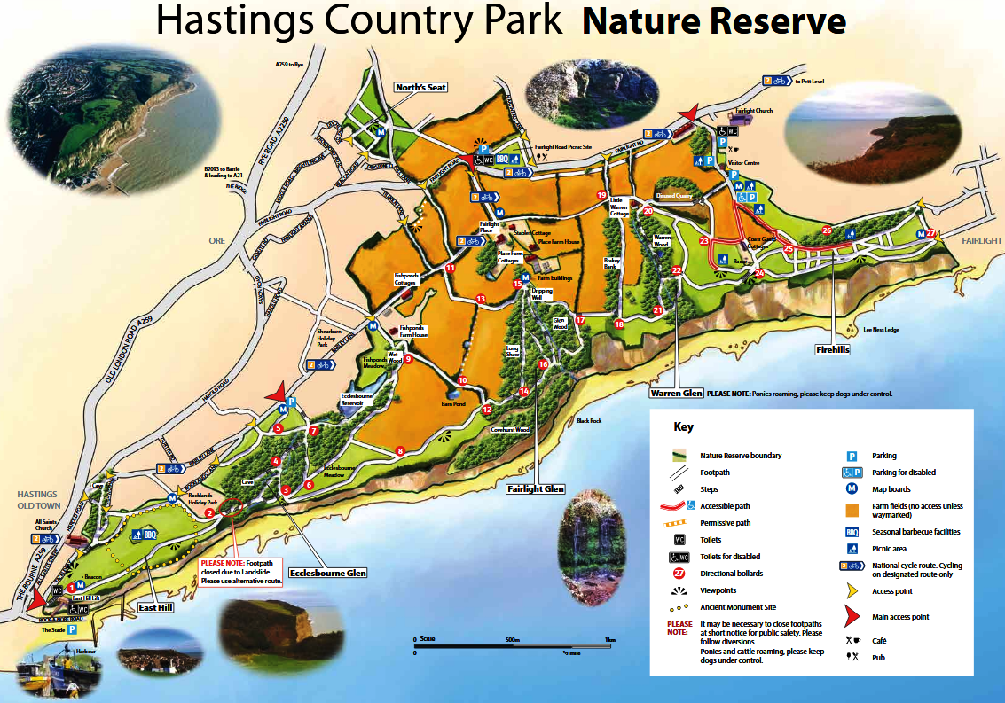 Hastings Council in 1971 set up the Hastings Country Park, then consisting of 510 acres of cliff-top walks, the three glens -Ecclesbourne, Fairlight and Warren - and the East Hill. At that time the Council also owned a further 300-plus acres of adjoining farmland, leased to a farmer. When this farm was repossessed in 2001 the Council decided to manage the Country Park and farmland together, along with a small amount of other land, as a ‘local nature reserve’ under the 1949 National Parks Act. This was formally agreed in July 2006, creating the Hastings Country Park Local Nature Reserve. The Reserve now consists of 522 acres of designated Country Park and 331 acres of farmland.